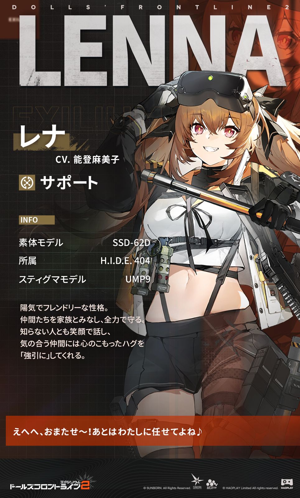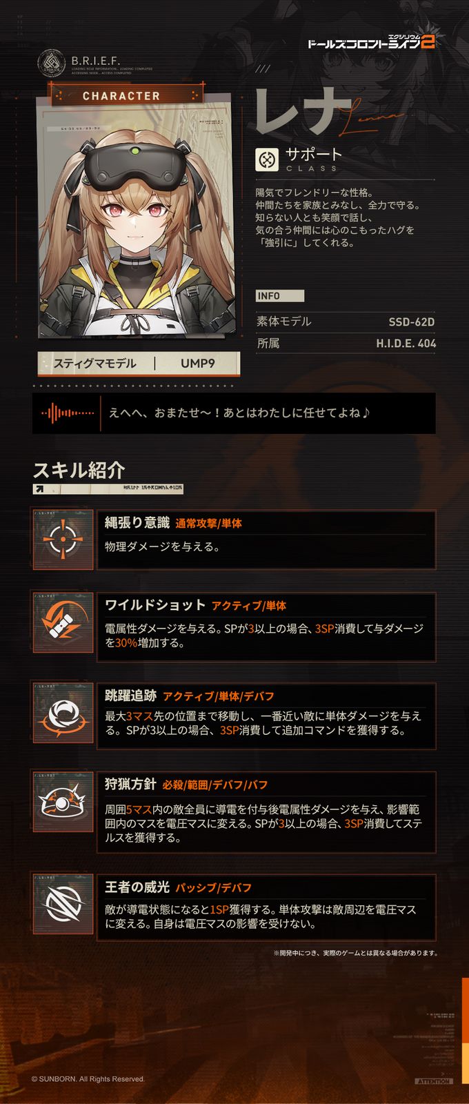 ドールズフロントライン2:エクシリウムに登場するSSR人形「レナ」の紹介です。